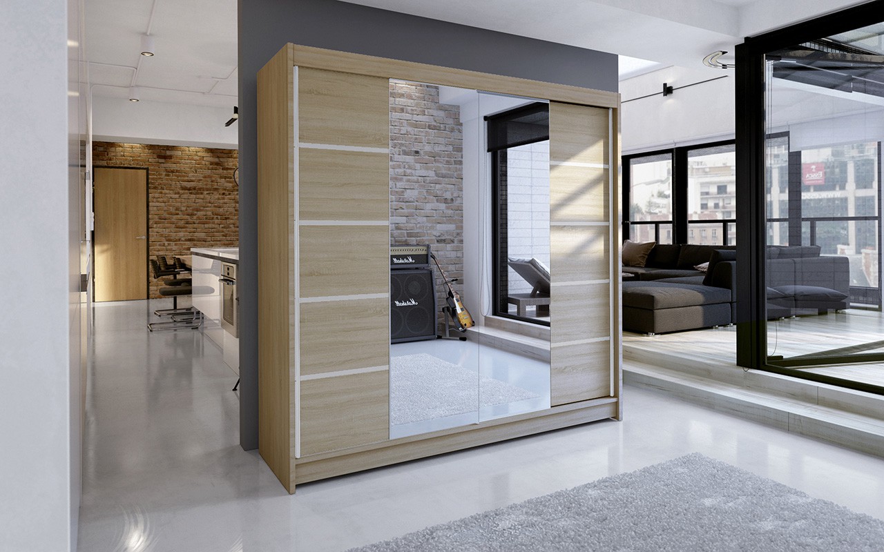 Раздвижной шкаф TRAVES — идеальное решение для организации пространства. Он оснащен просторными полками и штангой для вешалок, на которых можно хранить платья, костюмы, верхнюю одежду и рубашки. Передняя панель украшена зеркалом и характерными серебристыми горизонтальными полосами, придающими изделию неповторимый стиль. Благодаря раздвижной конструкции вам не нужно создавать дополнительное пространство для открытия дверей, что делает его идеальным решением для небольшой комнаты или узкого коридора.