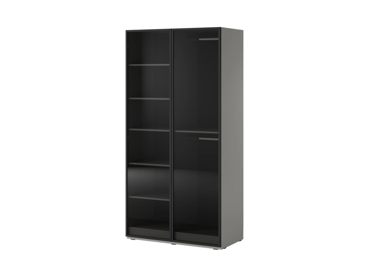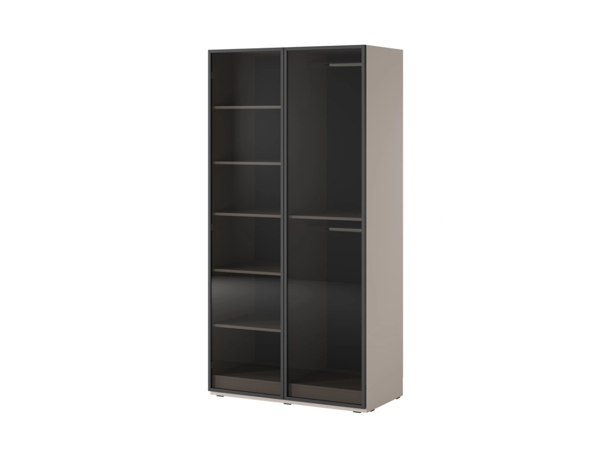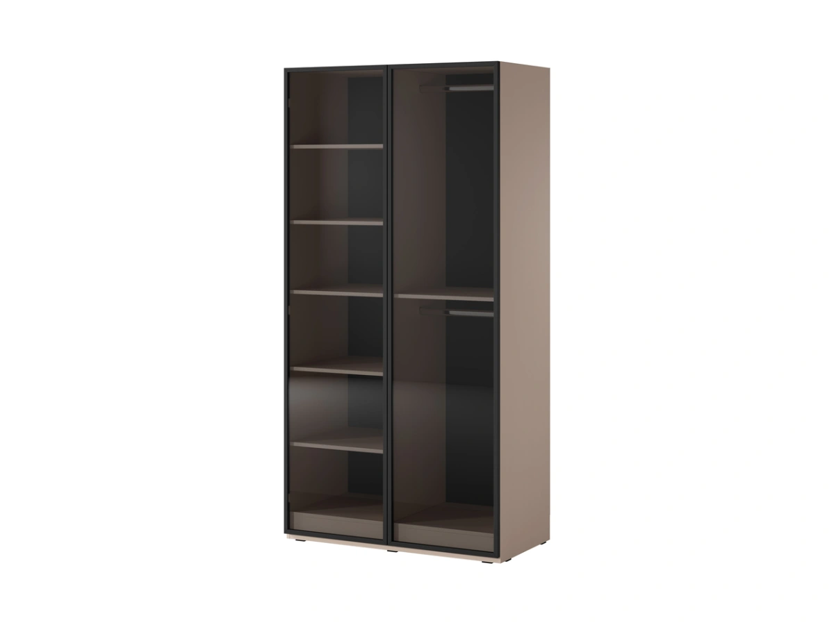 Шкаф имеет две передние стенки: на одной расположены две вешалки для одежды, а на другой — полки.