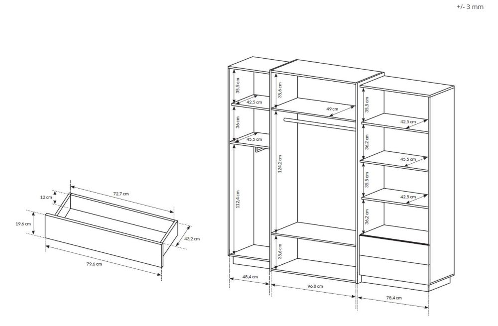 3D-гардероб – оснащен стандартной штангой для вешалок, штангой для вешалок с выдвижными ручками, многочисленными полками и двумя дополнительными выдвижными ящиками.