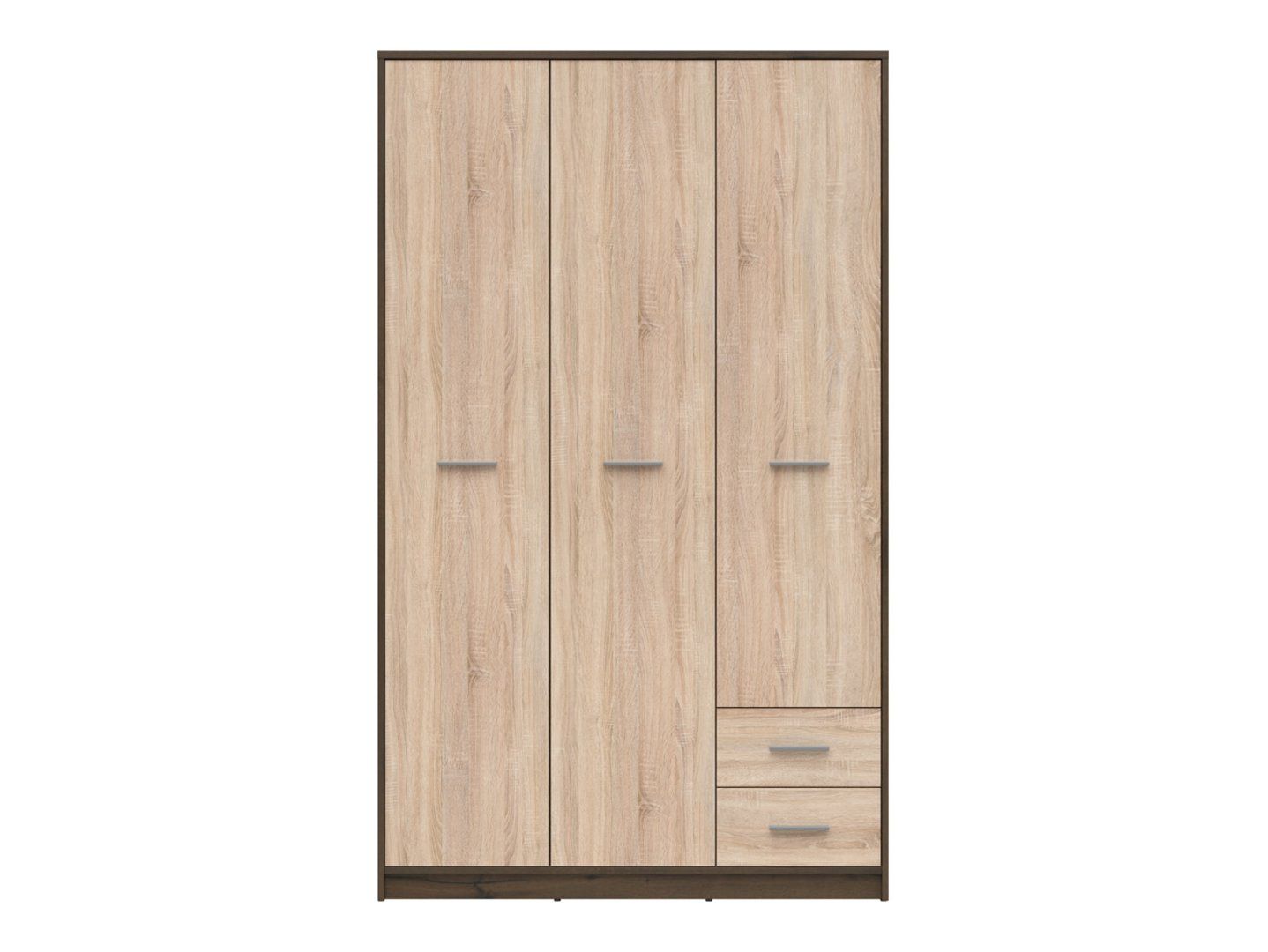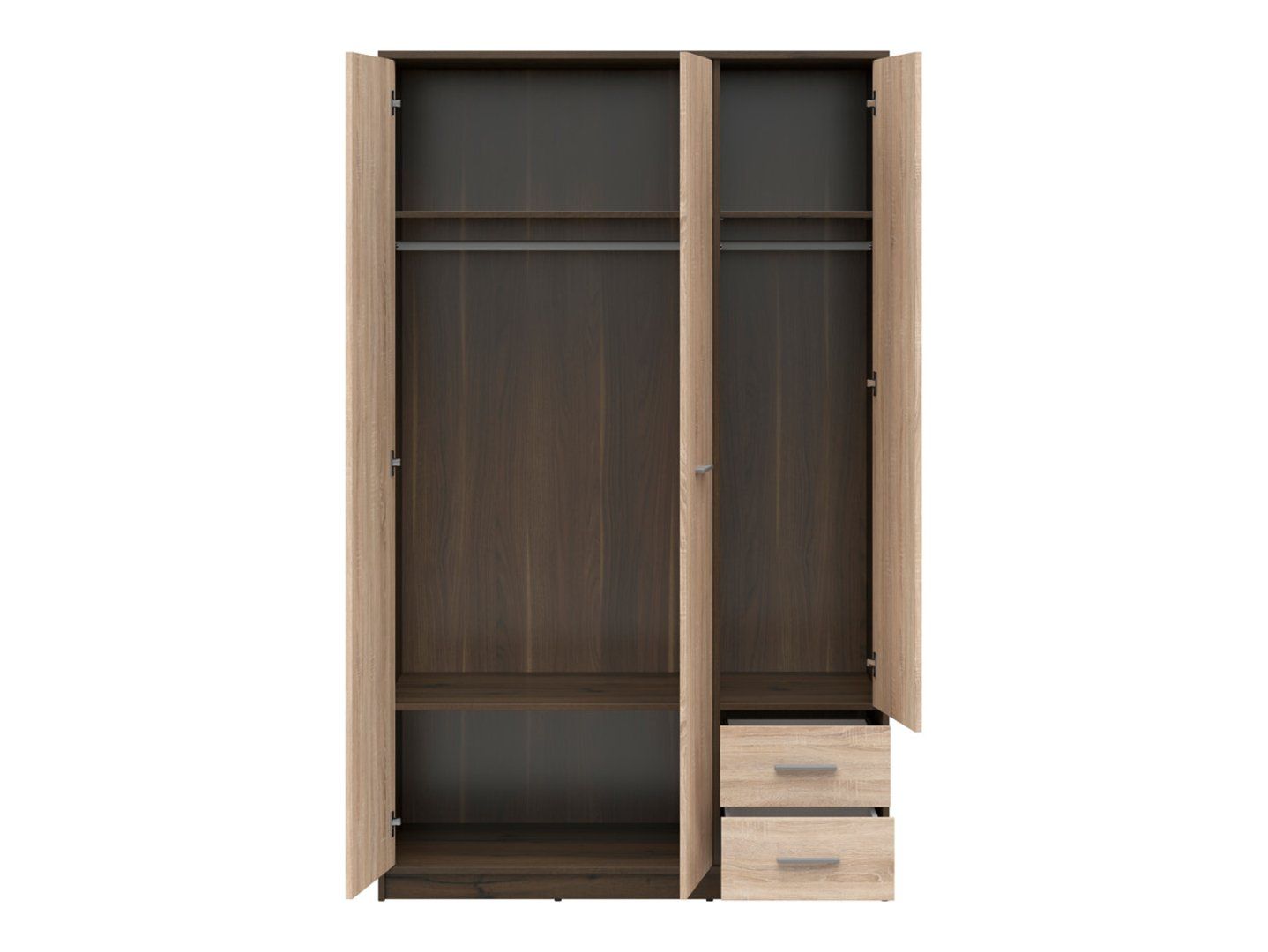 Шкаф изготовлен из ламинированной плиты, что делает его устойчивым к царапинам и перепадам температуры. Ламинат также облегчает уход за ним, что делает его идеальным решением для детской комнаты, комнаты подростка или даже офиса. Сочетание корпуса из благородного дуба с фасадами из дуба сонома придает шкафу современный и универсальный характер. Особенности: Трехдверная конструкция обеспечивает простор и функциональность. Две верхние полки и две штанги для вешалок обеспечивают удобную организацию пространства. Два компактных ящика позволяют хранить нижнее белье и аксессуары. Дополнительные полки можно расширить тремя широкими или двумя узкими полками. Ламинированная поверхность устойчива к царапинам и легко чистится. Благородный цвет дуба с фасадами из дуба сонома обеспечивает универсальный стиль. Простые ручки обеспечивают удобство использования.