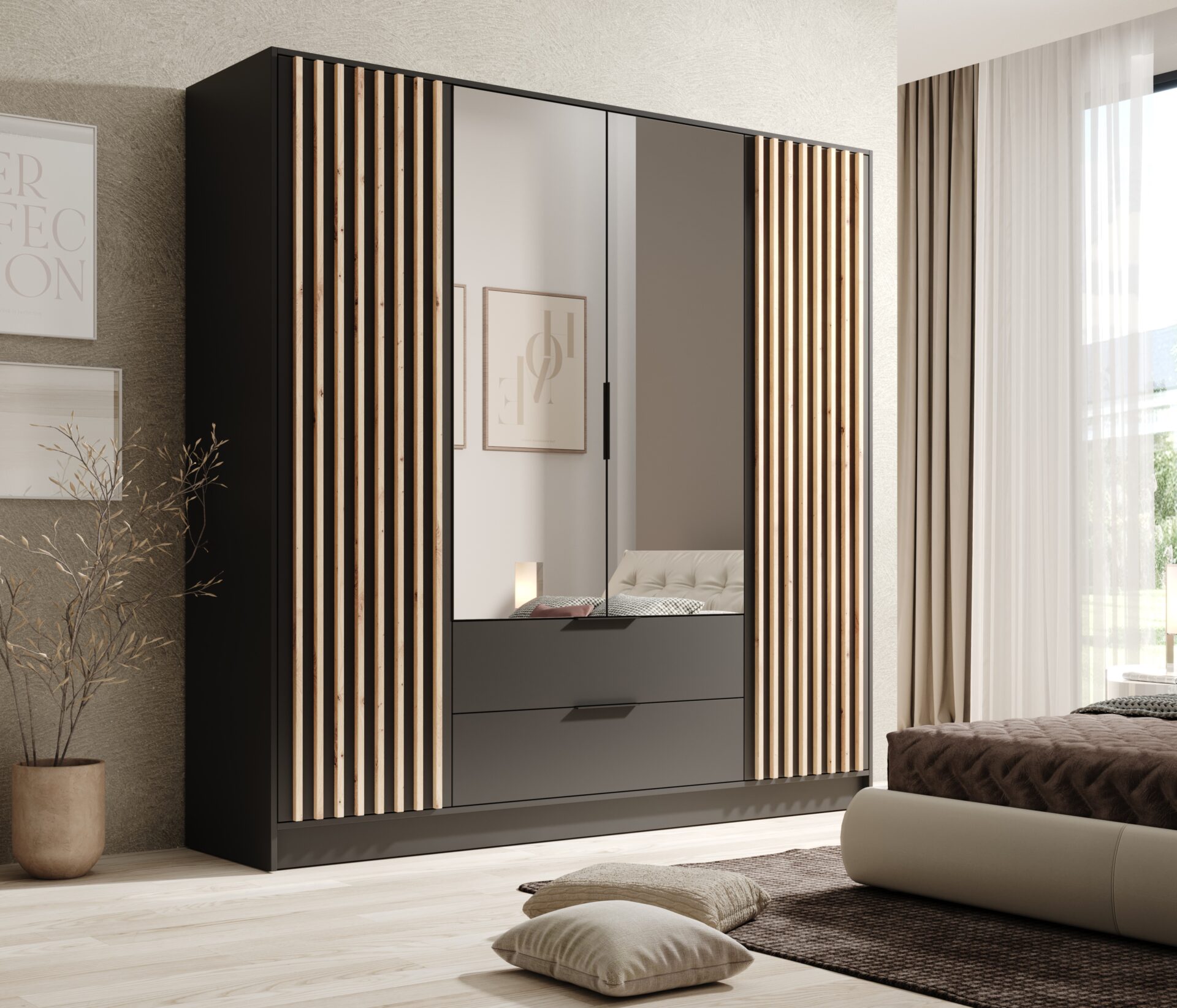 Распашной шкаф Neri — это элегантный и функциональный шкаф, который идеально дополнит как современные, так и классические интерьеры. Благодаря широкому выбору цветов каждый найдет вариант, идеально подходящий к его стилю. Шкаф Neri имеет декоративные планки на фасадах и большое зеркало, которые визуально расширяют пространство и создают ощущение легкости. Шкаф доступен в трех практичных размерах: – 100 см — компактный, идеально подходит для небольших комнат; – 150 см — идеальный компромисс между пространством и размером; – 200 см — просторный вариант, идеально подходящий для хранения вещей в большом шкафу. Каждая версия разработана с учетом удобства использования и эстетики, украсив любую спальню или гардеробную.