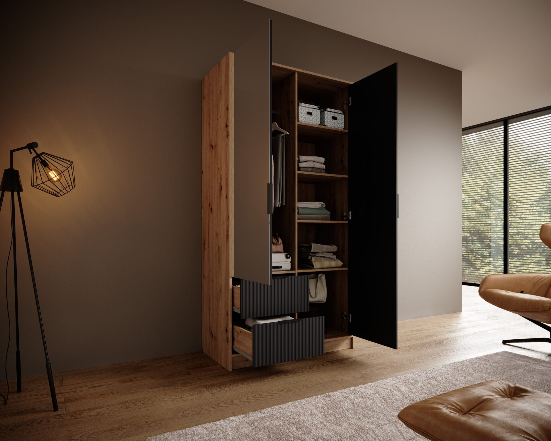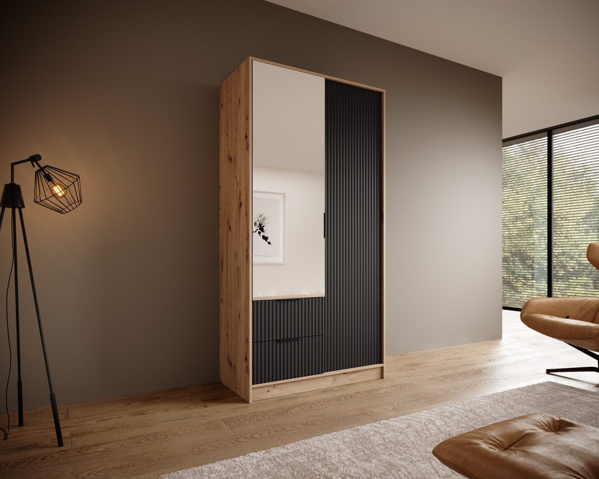 Шкаф Norel — это предмет мебели, отличающийся элегантностью и современным дизайном. Его рифленая структура придает ему изысканный вид, добавляя текстуру и глубину помещению. Центральным элементом является большое зеркало, которое не только визуально расширяет пространство, но и выполняет практическую функцию, позволяя проверить свой внешний вид перед выходом.