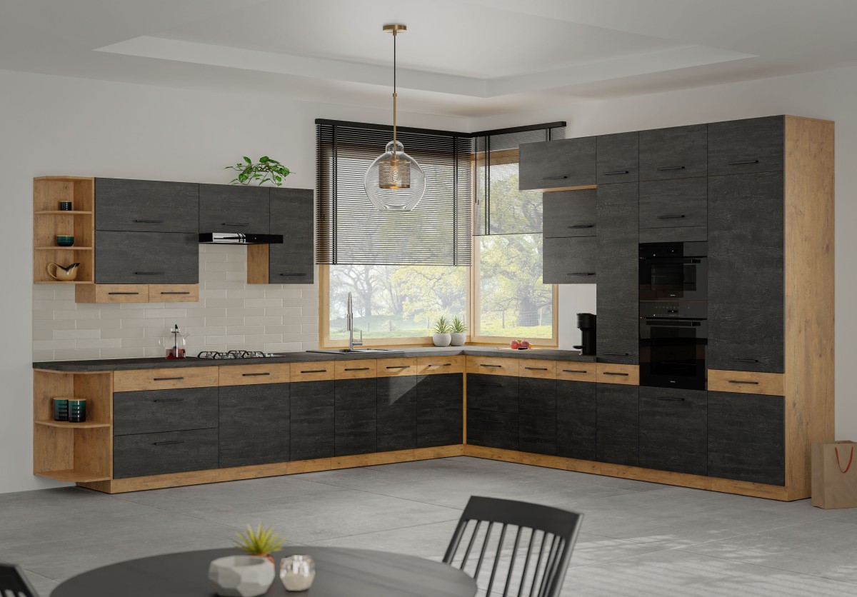 Кухня Vigo — это комплект очень практичной и красивой мебели. Система состоит из десятков шкафов — кухонной мебели в стиле лофт. Фасады шкафов выполнены из массива дерева. Столешницы и рамы образуют единую цветовую гамму. Массивные ручки придают мебели характер и облегчают доступ к хранящимся внутри продуктам. Они идеально дополняют весь комплект.