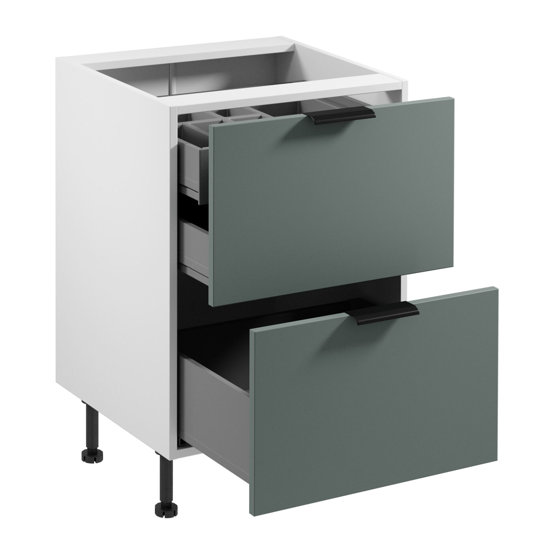 Нижний кухонный шкаф Sorento 2S со встроенным отделением для столовых приборов — это идеальное сочетание элегантности и функциональности, которое оживит вашу кухню. Стильная матовая зеленая передняя панель в сочетании с матовым белым корпусом идеально соответствует последним тенденциям в дизайне интерьера, привнося свежесть и гармонию в пространство. Этот шкаф идеально впишется как в современный, так и в классический дизайн кухни, добавив ей неповторимый характер. Практичность — одно из ключевых преимуществ шкафа Sorento. Два внешних ящика и один внутренний ящик со встроенным отделением для столовых приборов позволяют легко организовать все необходимые кухонные принадлежности. Разработанные для эффективного использования пространства, ящики выдерживают до 40 кг каждый, обеспечивая их вместимость даже при интенсивном использовании. Каждый ящик оснащен механизмом плавного закрывания, обеспечивающим комфорт во время приготовления пищи и уборки. Высокие ножки добавляют эстетическую ценность и облегчают повседневное использование. Регулируемые на 15 см ножки позволяют настроить шкаф под ваши нужды, что особенно важно в домах с неровным полом. Кроме того, черные металлические ручки подчеркивают современный характер шкафа и добавляют нотку изысканности.