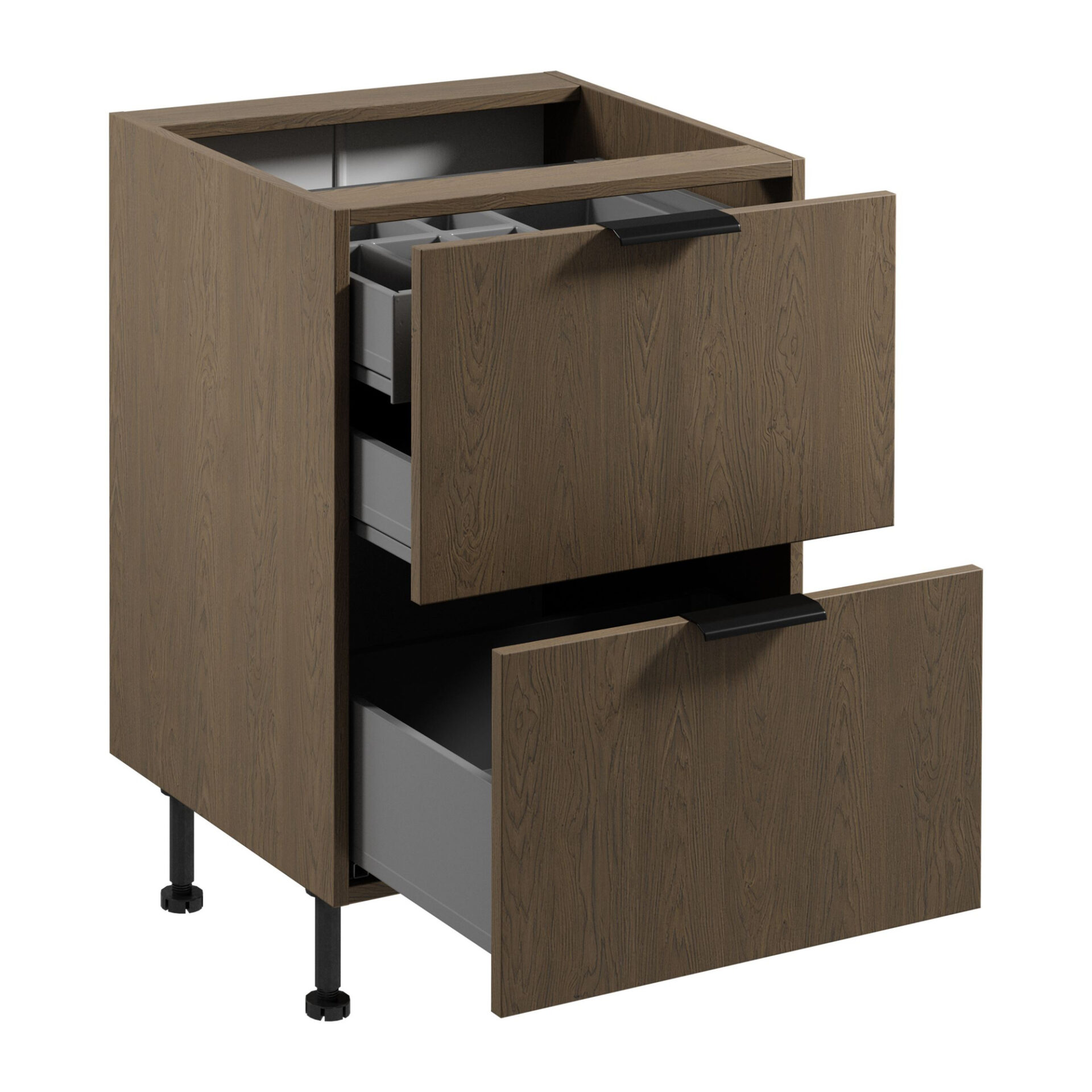 Кухонный шкаф Sorento D60S2+1 AX Baltic Storm с нишей для столовых приборов 2S — идеальное решение для вашей кухни, отвечающее не только функциональным требованиям, но и добавляющее элегантности и современного стиля вашему интерьеру. Изготовленный из ламинированной плиты Baltic Storm, его нежная текстура и сдержанные цвета гармонично сочетаются с различными вариантами расстановки мебели, создавая уютную атмосферу в сердце вашего дома. Функциональность — ключевой элемент, отличающий этот шкаф. Оснащенный двумя практичными внешними ящиками и одним внутренним ящиком с нишей для столовых приборов, он обеспечивает эффективное хранение и организацию кухонных принадлежностей. Благодаря бесшумным направляющим полного выдвижения и механизму плавного закрывания использование шкафа становится невероятно комфортным, что является неоценимым преимуществом в повседневной работе. Высокие регулируемые по высоте ножки позволяют адаптировать шкаф к вашим индивидуальным потребностям. Устойчивость и прочность конструкции обеспечивают большую рабочую поверхность, идеально подходящую для ежедневного приготовления пищи. Расстояние 15 см под шкафом не только повышает комфорт использования, но и облегчает уборку под мебелью, что является чрезвычайно практичным решением.