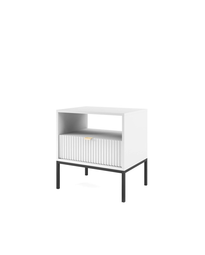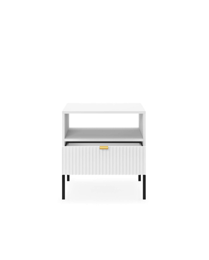Привлекательная прикроватная тумба Nova S54 оснащена вместительным ящиком и практичной нишей. Корпус выполнен из белой мебельной плиты, а передняя панель — из рифленой белой МДФ, украшенной элегантной золотой ручкой. Вся тумба опирается на высокие (20 см) черные ножки, соединенные с прочным и устойчивым основанием. Тумба изготовлена из ламинированной мебельной плиты, которая обладает высокой устойчивостью к царапинам и легко чистится. Тумба поставляется в разобранном виде с подробной инструкцией по сборке. Доступен вариант с золотой рамой.
