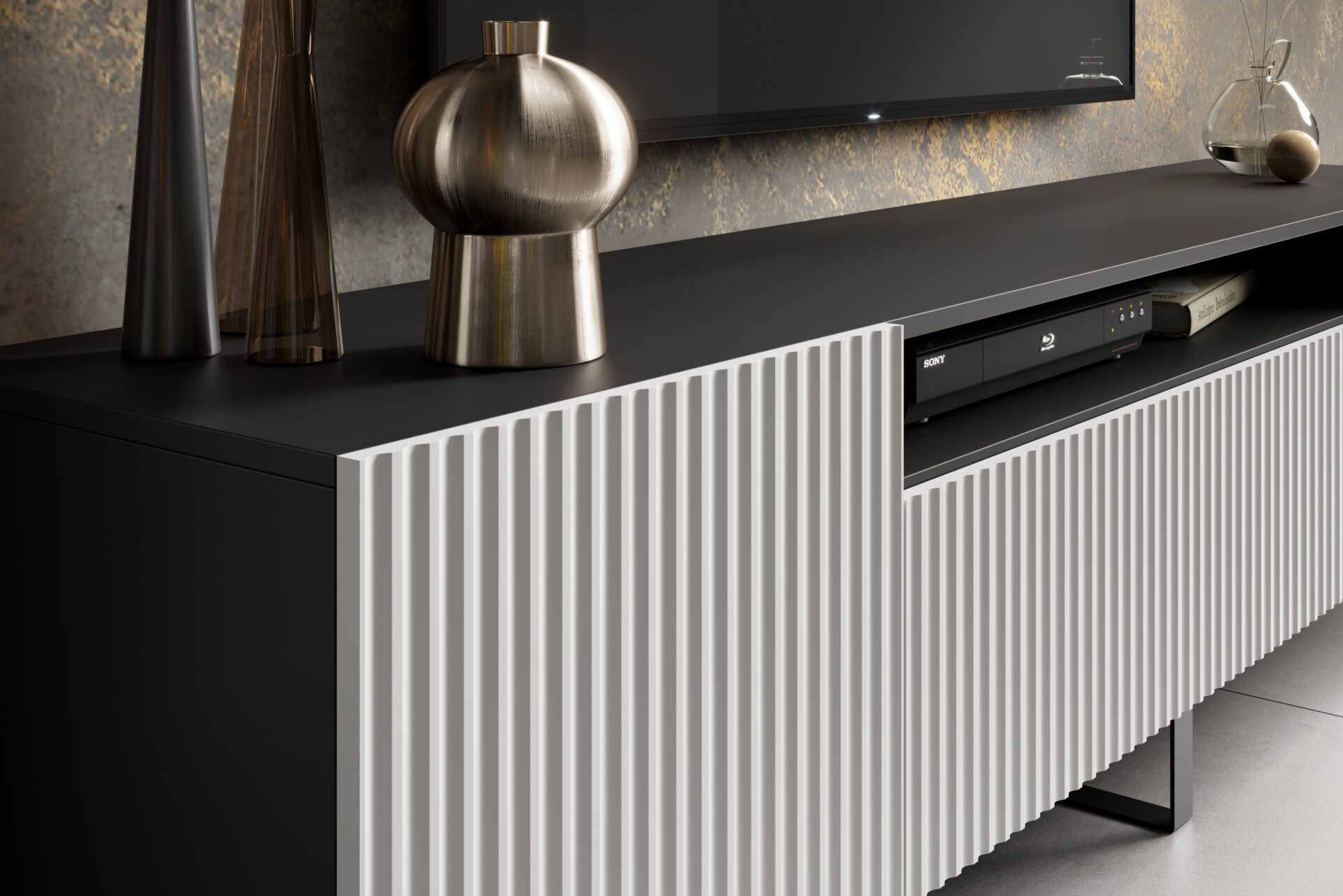 Тумба под телевизор Noemi — это современная, элегантная и функциональная подставка, идеально подходящая для современных интерьеров. Ее уникальная особенность — рифленая отделка, которая придает изделию характер и текстуру. Тумба спроектирована таким образом, чтобы иметь достаточно отделений и полок для размещения различной электронной техники, включая телевизор, телеприставку, игровую консоль и многое другое.