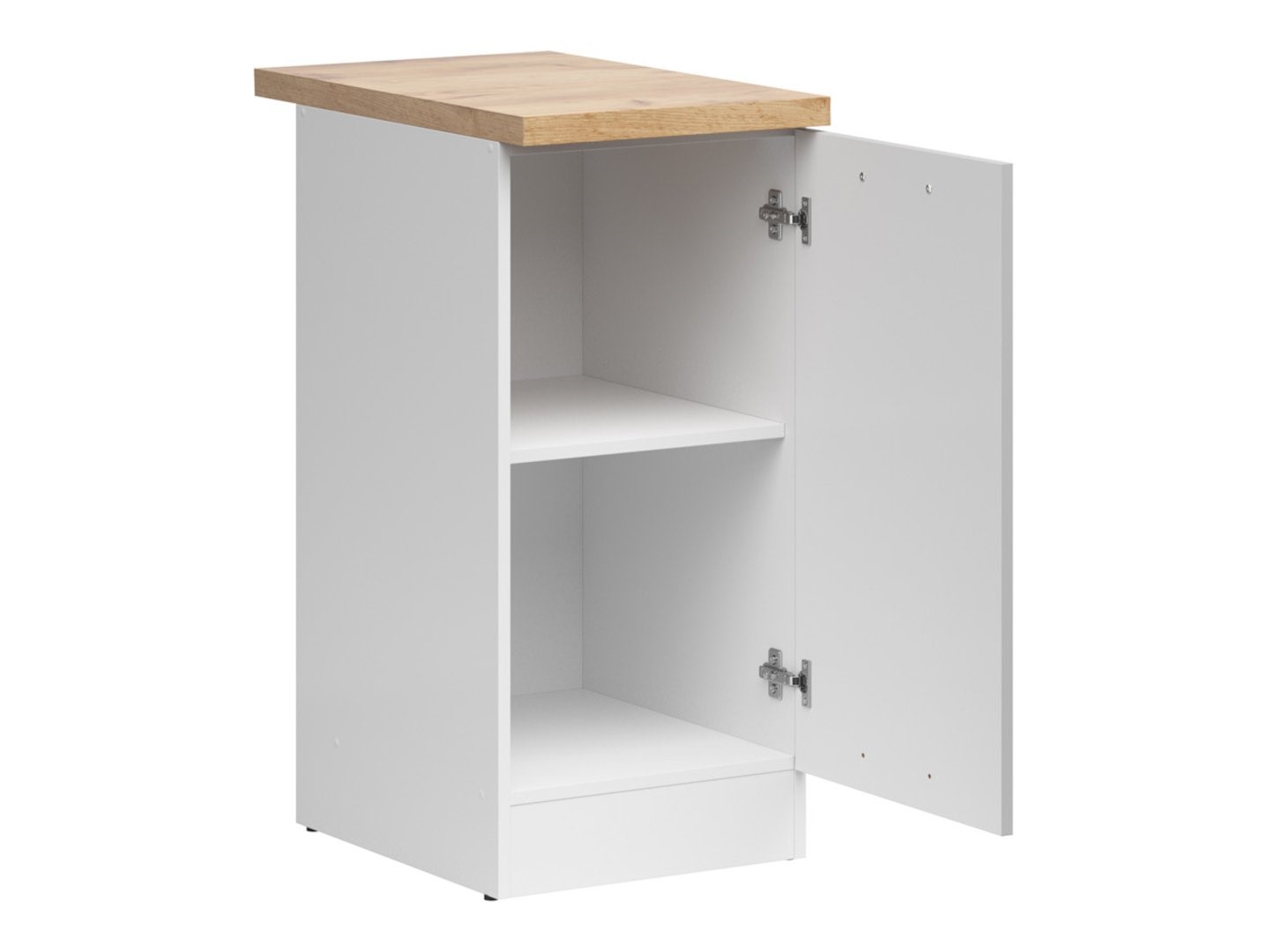 Напольный шкаф Junona Line со столешницей идеально подходит для тех, кто хочет иметь функциональную кухню. Шкаф оснащен практичной полкой, которая разделяет внутреннее пространство на две секции, что позволяет легко организовать кухонные принадлежности в соответствии с потребностями пользователя. Оптимальные размеры 40×86 см делают его идеальным решением даже для небольших кухонь, помогая эффективно использовать доступное пространство рядом с духовкой, раковиной и мусорным ведром.