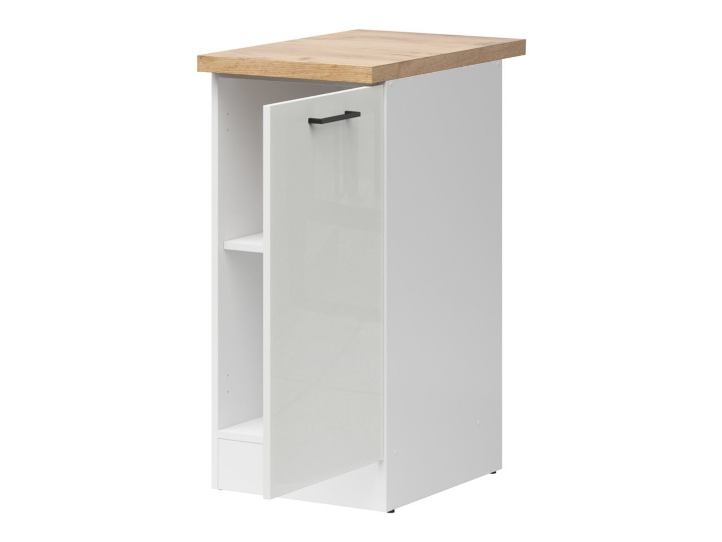 Напольный шкаф Junona Line со столешницей идеально подходит для тех, кто хочет иметь функциональную кухню. Шкаф оснащен практичной полкой, которая разделяет внутреннее пространство на две секции, что позволяет легко организовать кухонные принадлежности в соответствии с потребностями пользователя. Оптимальные размеры 40×86 см делают его идеальным решением даже для небольших кухонь, помогая эффективно использовать доступное пространство рядом с духовкой, раковиной и мусорным ведром.