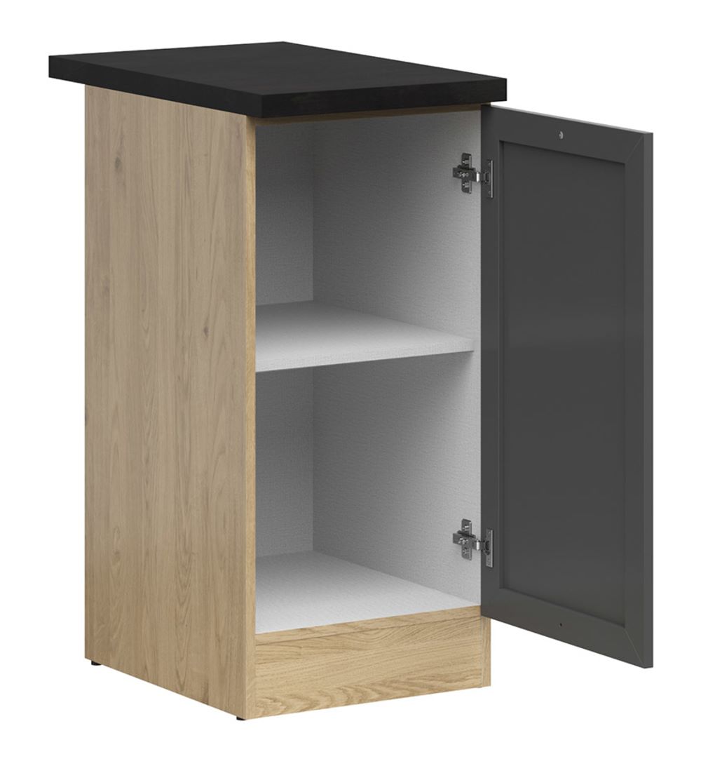 Встраиваемый шкаф со столешницей занимает пространство 40×60 см и открывается вправо. Шкаф отличается минималистичным дизайном: корпус из дуба Bernstein и фасады графитового цвета дополнены стильной рамой. Контрастная столешница из черного и золотого металлического сланца добавляет элегантности. Кроме того, шкаф оснащен классической ручкой-кнопкой, которая не только облегчает открывание, но и придает ему индивидуальность. Другие элементы и аксессуары коллекции Junona Line доступны на emkameble.pl. Модульная кухонная мебель — это решение не только для маленьких, но и для больших кухонь. Сочетайте базовый шкаф с другими элементами коллекции Junona Line и создайте комплект, соответствующий вашим потребностям.