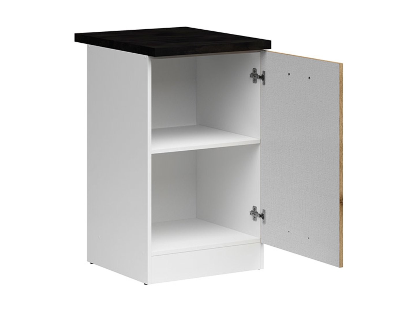 Встраиваемый шкаф со столешницей занимает пространство 50×60 см и открывается вправо. Шкаф отличается минималистичным дизайном: белый корпус и гладкие фасады из светлого дуба Delano. Контрастная столешница из черного и золотого металлического сланца добавляет элегантности. Кроме того, шкаф оснащен классической черной ручкой, которая не только облегчает открывание, но и придает ему индивидуальность. Другие элементы коллекции Junona Line и аксессуары доступны на emkameble.pl. Модульная кухонная мебель — это решение не только для маленьких, но и для больших кухонь. Сочетайте базовый шкаф с другими элементами коллекции Junona Line и создайте комплект, соответствующий вашим потребностям.