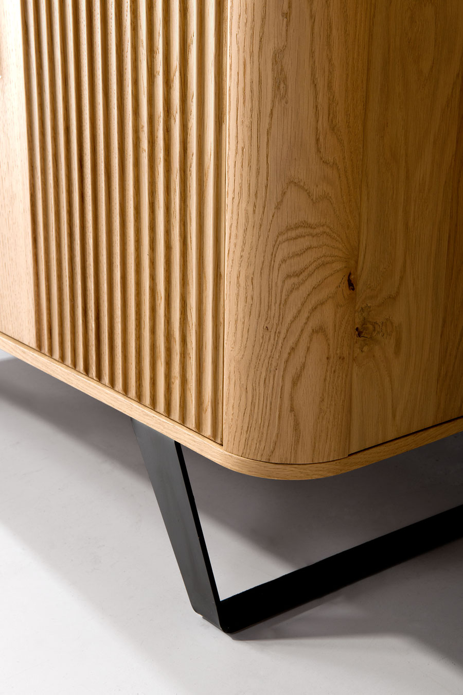 Широкий комод SANTOS SA1-K4. Эксклюзивная коллекция с 3D-фасадом и текстурой натурального дуба создает теплый, современный характер. Черные стальные ножки и черная отделка — выражение современной эстетики, отдающей ностальгией по прошлому. Витрины имеют задние стенки с грубой текстурой, а мягкое освещение полок подчеркивает очарование дубовой конструкции. Столешница: МДФ, ламинированный дубовым шпоном.