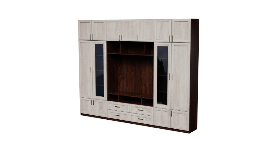 The central TV section provides convenient space for a TV and multimedia equipment, while numerous shelves and lockable cabinets facilitate storage of everyday items. A distinctive feature of the VERO model is the glass display cabinets, which lend the entire structure a lightness and allow for the elegant display of decorations, books, or glassware without overwhelming the space.