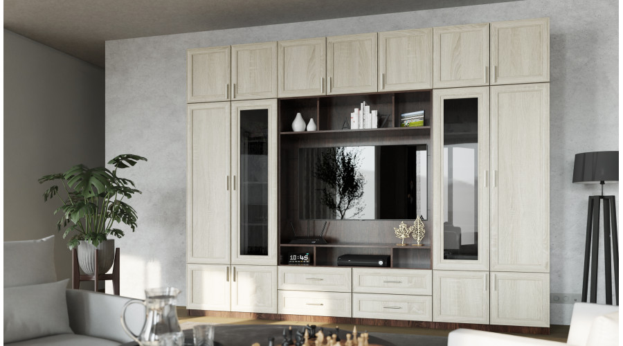 The combination of the two Sonoma shades brings a natural, warm character inspired by the grain of wood to the living room. This color scheme works well in both modern and more classic interiors, creating a cozy yet uncluttered interior. The wall unit harmoniously complements other furniture and accessories, providing a neutral yet expressive backdrop for the living room space. VERO is a solution for those looking for a TV wall unit with ample storage space, without the need for multiple separate pieces. This set allows you to maintain aesthetics and functionality even in a busy living room.