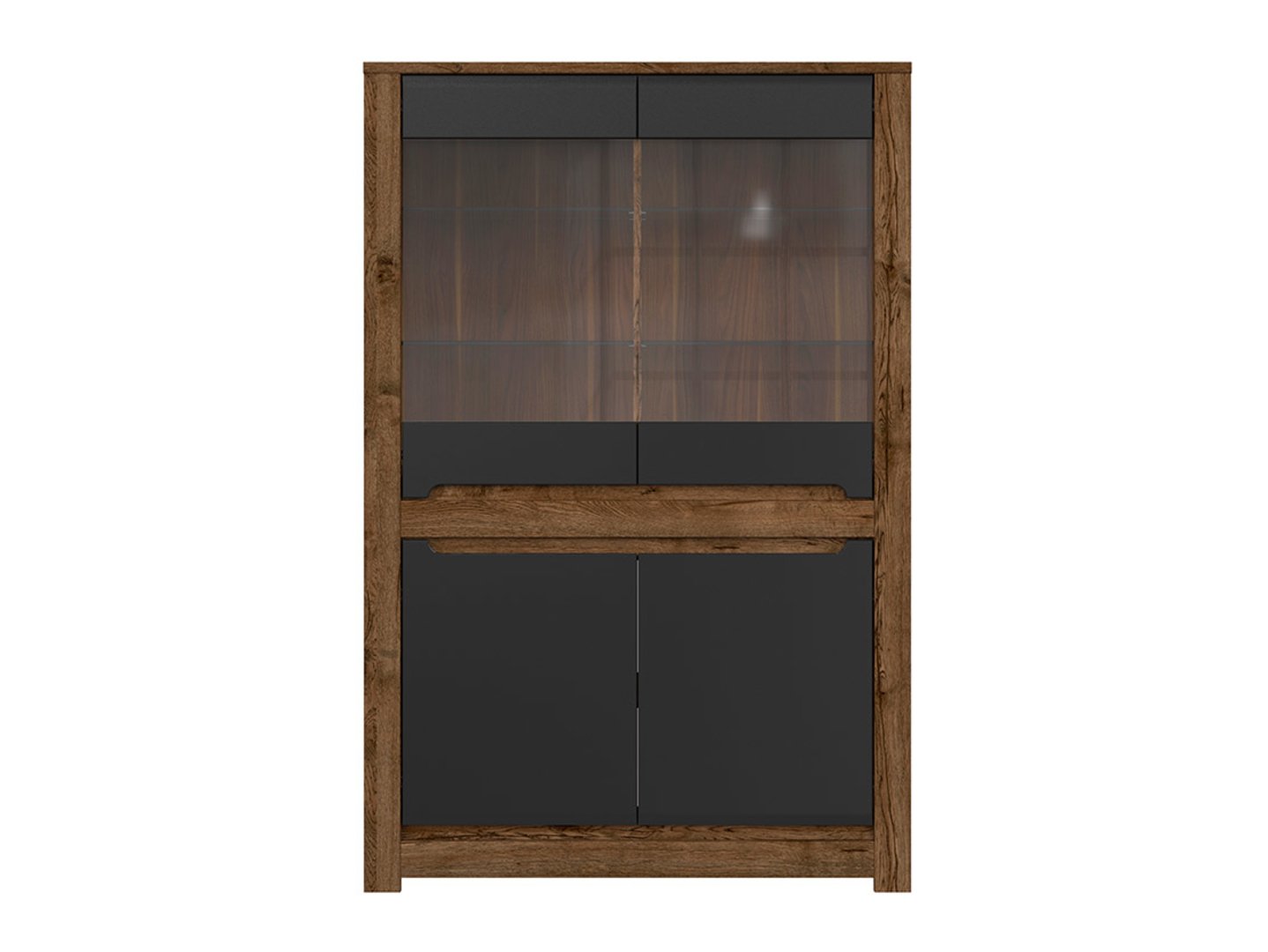 Dviejų durų vitrina su dviem stikliniais fasadais RUSO 104 cm, balandžio ąžuolo spalvos/matinės juodos spalvos
