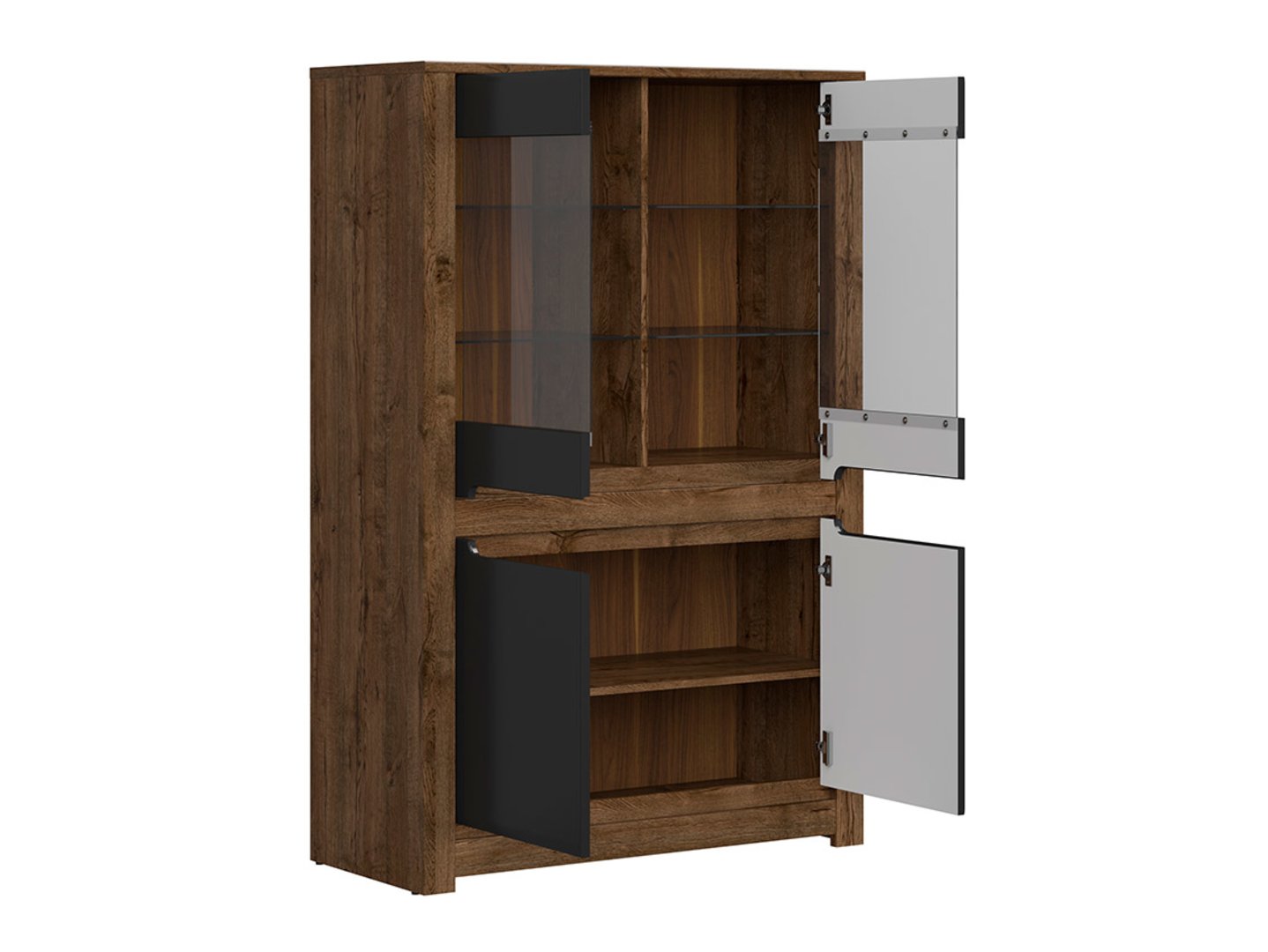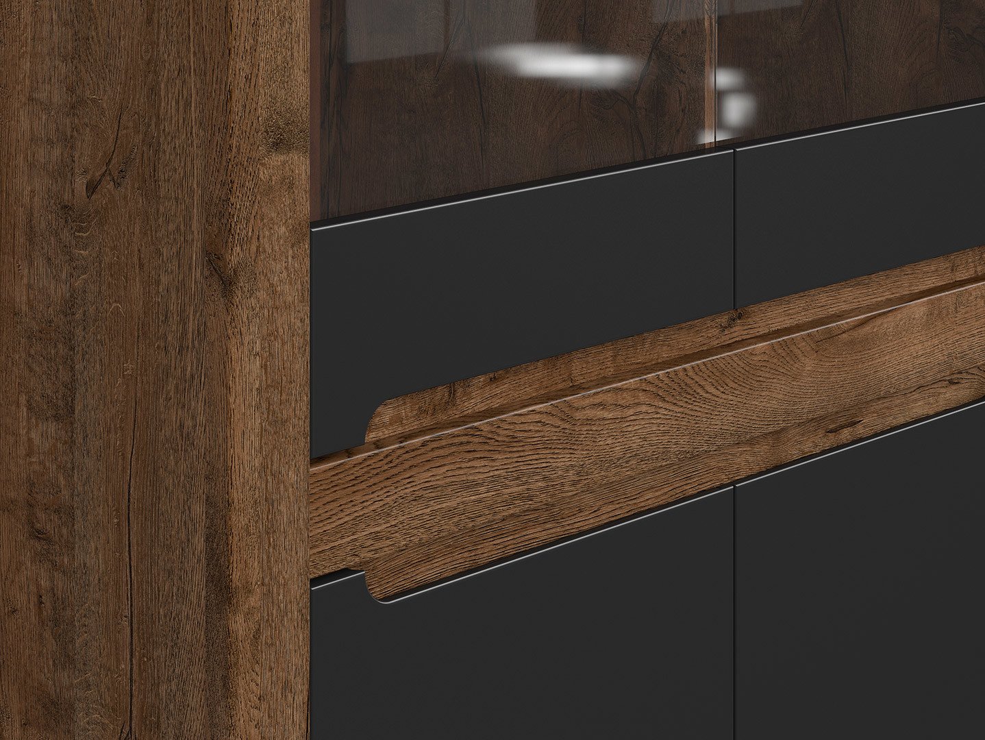 Витрина Ruso – откройте для себя лучшее в вашей гостиной. Коллекция Ruso выделяется своей простотой, темной цветовой гаммой и сдержанными, но элегантными деталями, что делает ее идеальным выбором для классических интерьеров. Вот почему витрина Ruso идеально подходит для того, чтобы помочь вам открыть для себя лучшее в вашей гостиной: Витрина Ruso – это эффектный предмет, который станет центром внимания в вашей гостиной. За передней панелью из закаленного стекла вы можете выставить все предметы, которые придадут вашему дому неповторимый характер. Кроме того, запирающийся шкаф внизу предлагает место для хранения вещей, которые вы хотите скрыть от посторонних глаз. Если вы хотите подчеркнуть выставленные предметы и создать уникальную атмосферу в вашей гостиной, дополнительная светодиодная подсветка – идеальное решение. Это добавит не только элегантности, но и изысканности в дизайн интерьера. Сочетание цвета корпуса April Oak и матовых черных фасадов создает основу для стильных композиций. Естественная текстура древесины в корпусе добавляет красоты и характера. Углубления на фасадах, выполняющие функцию ручек, и декоративные цоколи придают витрине Ruso уникальный вид и подчеркивают ее характер. Витрина Ruso поставляется с матовой полосой цвета лавы, которую можно установить в углубления на фасадах, что придает ей еще больше элегантности. Благодаря петлям с доводчиками и регулируемому тормозу, использование витрины Ruso комфортно и бесшумно каждый день. Двухдверная витрина Ruso идеально дополняет другие предметы из коллекции Ruso. Вы можете комбинировать ее с другой мебелью из этой коллекции, чтобы создать гармоничное и функциональное пространство в вашей гостиной. Вкратце, витрина Ruso — это предмет мебели, который не только продемонстрирует ваши любимые вещи, но и добавит элегантности и характера вашей гостиной. Благодаря тщательной работе мастеров, контрастным цветам, мягкому освещению и многочисленным вариантам расстановки предметов из коллекции Ruso, вы можете создать пространство, отражающее ваш вкус и образ жизни, раскрывая лучшие стороны вашего интерьера.