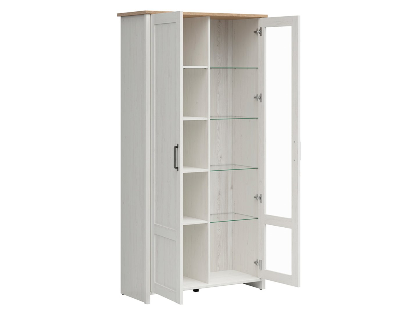 Витрина Loksa – элегантная витрина в скандинавском стиле. Скандинавский стиль в настоящее время является одной из самых популярных концепций дизайна интерьера, характеризующейся простыми формами, вниманием к деталям и яркими цветами. Коллекция Loksa идеально воплощает эти ценности, сочетая минималистичную эстетику с функциональностью. Витрина Loksa – идеальный предмет мебели для гостиной, позволяющий элегантно демонстрировать и хранить различные предметы. Если вам нужно место для хранения документов, сувениров из путешествий или других ценностей, витрина Loksa – это решение для вас. Скрытые полки за сплошной передней панелью позволяют организовать документы и другие предметы, которые вы хотите спрятать, а стеклянная передняя панель служит идеальным фоном для декоративных ваз или других украшений. Кроме того, подсветка, встроенная под стеклянные полки, подчеркивает красоту демонстрируемых предметов. Цветовая гамма витрины соответствует остальной коллекции Loksa, обеспечивая целостность интерьера. Белый корпус и передняя панель из сосны Andersen гармонично дополняют столешницу из дуба Grandson. Это сочетание цветов добавляет свежести и скандинавского шарма интерьеру. Декоративные стойки на фасадах и прочные, стильные ручки придают изделию характер и элегантность. Высокий витринный шкаф Loksa можно сочетать с другими предметами из коллекции, такими как комод или тумба под телевизор, что позволит создать гармоничный и функциональный дизайн интерьера. Этот предмет мебели не только украсит ваш интерьер, но и поможет вам демонстрировать и хранить ваши любимые вещи, придавая им элегантный скандинавский стиль.